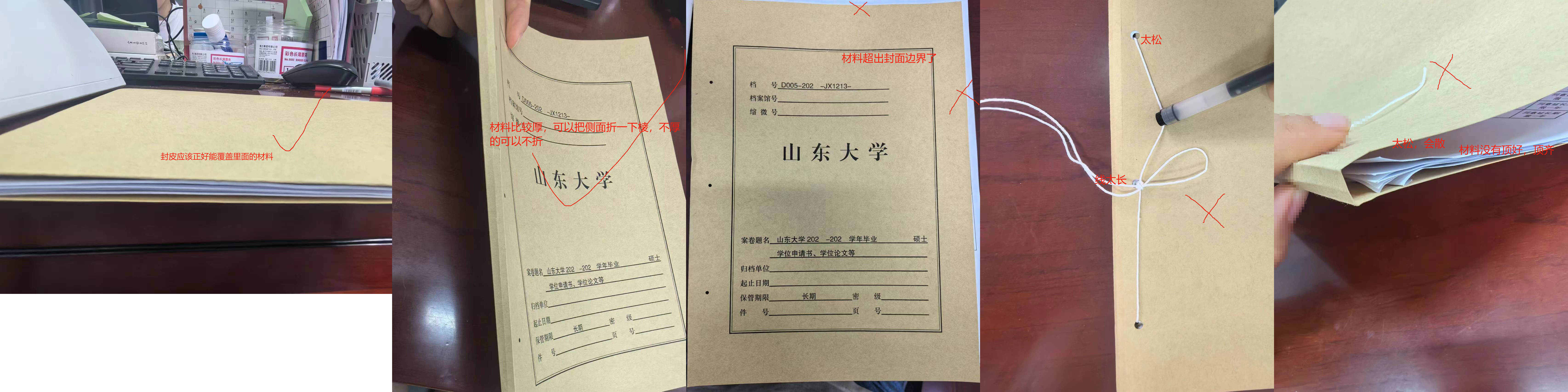 将线两头分别穿入中间形成的线孔中拉紧系死扣即可,打印店提供打孔服务,不要装的松松散散,务必保证整本以后不会散掉,避免以后同学们查档发现材料缺失,造成麻烦。 正确示例,错误示例见图