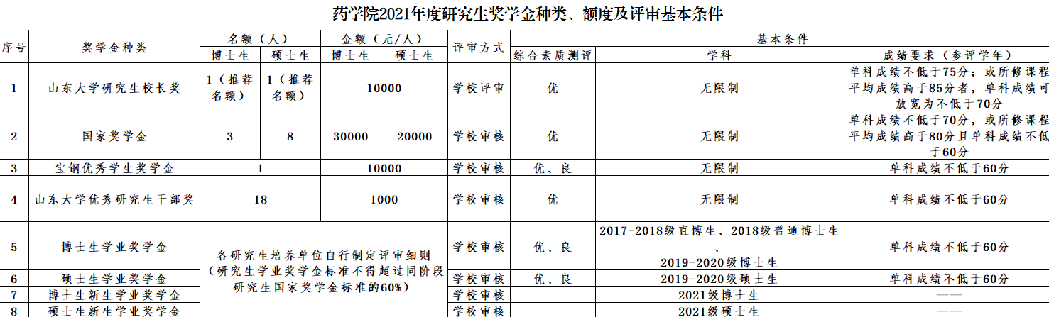各位同学: 现进行2021年度奖学金评选,根据学院实际情况,具体要求如下: 一、参评条件 1.研究生奖学金参评范围为:(1)具有中华人民共和国国籍,纳入全国研究生招生计划的,录取类别为全日制非定向就业的(档案及工资关系已转入山东大学、无固定工资收入)在学研究生(规定学制年限内);(2)“援疆博士师资专项计划”及签订非在职协议的“少数民族高层次骨干人才计划”研究生可参与研究生奖学金评比;(3)“高层次人才强军计划”及签订在职协议的“少数民族高层次骨干人才计划”研究生可参与学业奖学金、优秀研究生干部奖评比;(4)“科研经费博士生”专项计划招生的博士生学业奖学金由导师全额承担;(5)录取类别为全日制定向就业的研究生、非全日制研究生、超出规定学制年限的研究生、台湾、港澳及华侨学生、国际学生可参与校长奖和优秀研究生干部奖评比。 2.硕博连读研究生第一二学年按硕士研究生身份参评,第三学年至毕业按博士研究生身份参评;本科直博研究生按博士研究生身份参评。 3.研究生参评学年出现以下任一情况,不具备当年研究生奖学金参评资格:(1)违反国家法律、校纪校规受到纪律处分者、通报批评并取消奖学金资格者;(2)有学术不端行为经查证属实者;(3)培养计划所修课程单科成绩不及格者;(4)学籍状态处于休学、保留学籍者;(5)因私出国、疾病、创业等原因未在校学习者;(6)未按时交纳当年学费或住宿费者。 二、评审工作安排 1.成立评审组织 学院成立2021年度研究生奖学金评审委员会,其中包括学院主要领导、导师代表、研究生管理人员、学生代表(由非参评奖学金的学生自愿报名,根据专业、班级抽签产生)。各研究所成立由所长担任组长的评审小组,所秘书老师负责评审组织工作。 2.工作时间安排 本次奖学金评审的成果截止日期是10月17日24点。 10月21日下午5点前各研究所上报校长奖、国家奖学金推荐人选及相关材料;学业奖学金拟获奖名单。 10月22日-24日由奖学金复核小组(由奖学金申请人和各研究所自管会成员组成)对申报奖学金的相关材料进行复核。 暂定10月25-27日学院召开评审会,评审后进行公示。 公示结束后按学校要求上报材料。 3.奖学金评审范围及基本要求
