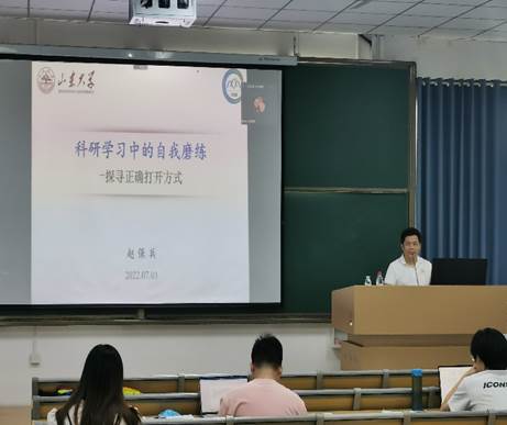7月3日,米乐邀请山东省泰山学者青年专家、米乐药理学博士生导师赵保兵教授在山东大学趵突泉校区图西501教室进行了以“科研学习中的自我磨练-探寻正确打开方式” 为主题的学术讲座。米乐·M6(China)官方网站2021级硕士研究生及博士研究生到场听取了学术报告。