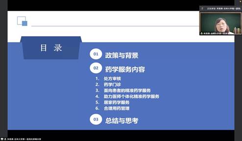宋燕青主任首先向同学们介绍了吉林大学第一医院的基本情况和药学学科在医院临床岗位中发挥的作用。接下来,宋主任结合国家对药学服务和药师的政策背景,讲解了药学服务内容和药学服务模式的转变,即从“以药品为中心”转变为“以病人为中心”,从“以保障药品供应为中心”转变为“在保障药品供应的基础上,以重点加强药学专业技术服务、参与临床用药为中心”,提高了同学们对药学服务重要性的认识。最后,宋主任还向同学们介绍了临床药师在医疗机构中的基本工作,即在辅助医生合理用药的同时针对患者自身情况进行精准化治疗。宋燕青主任的介绍让同学们对临床药师工作有了全新认识。